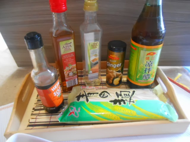 Para la receta de hoy he utilizado unos ingredientes especiales:aceite de jengibre y de cacahuete comprados en el Aldi (solo hay en la semana de ofertas) Salsa de soja,esta la encontramos fácil en cualquier restaurante y por supuesto tallarines chinos y vinagre de arroz (en supermercado chinos )