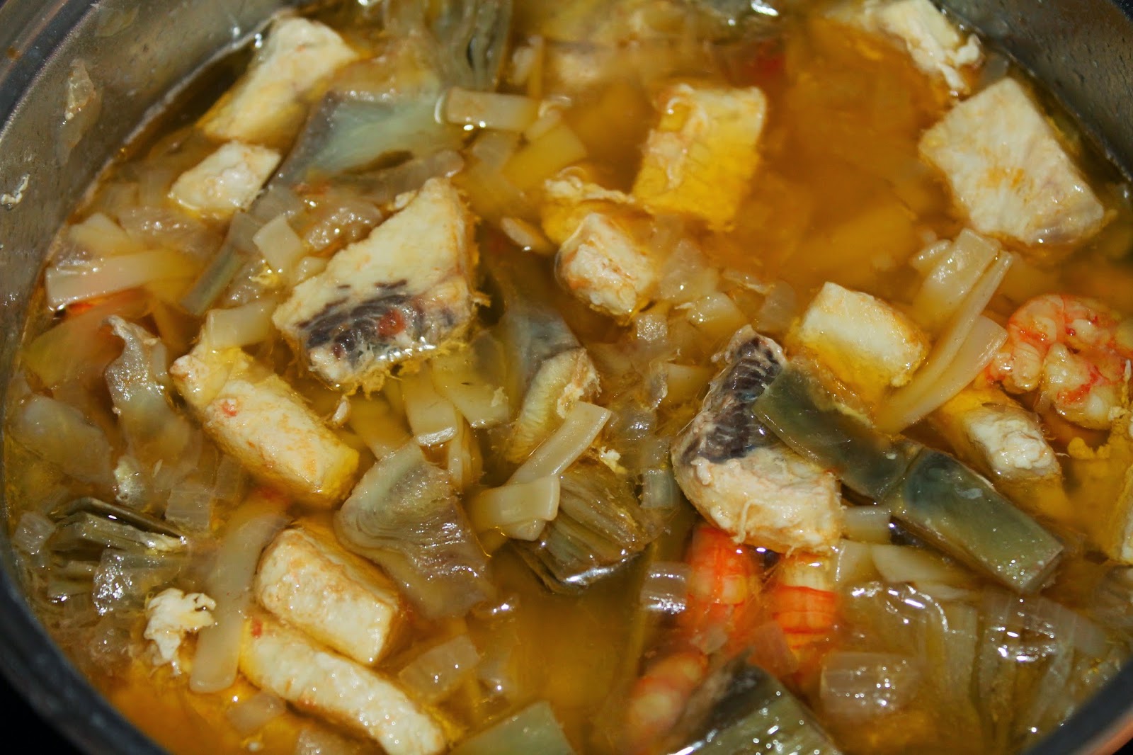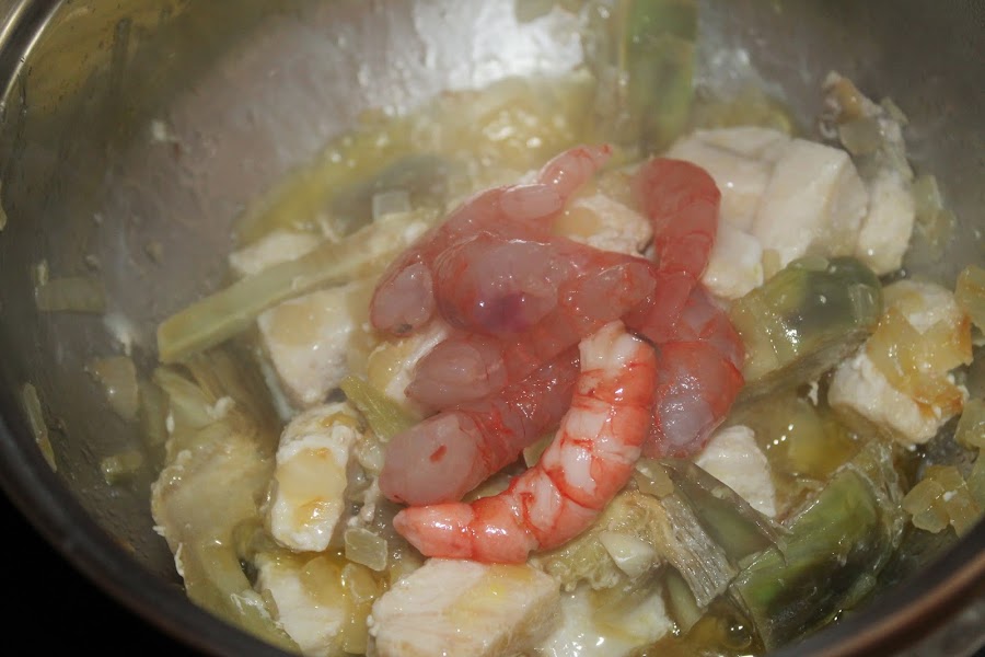 También se puede sustituir el pescado por pechuga de pollo, pero yo los voy a preparar con un poco de emperador y unas gambas, y como estamos en temporada de Alcachofas, también le vamos a poner un par de ellas.