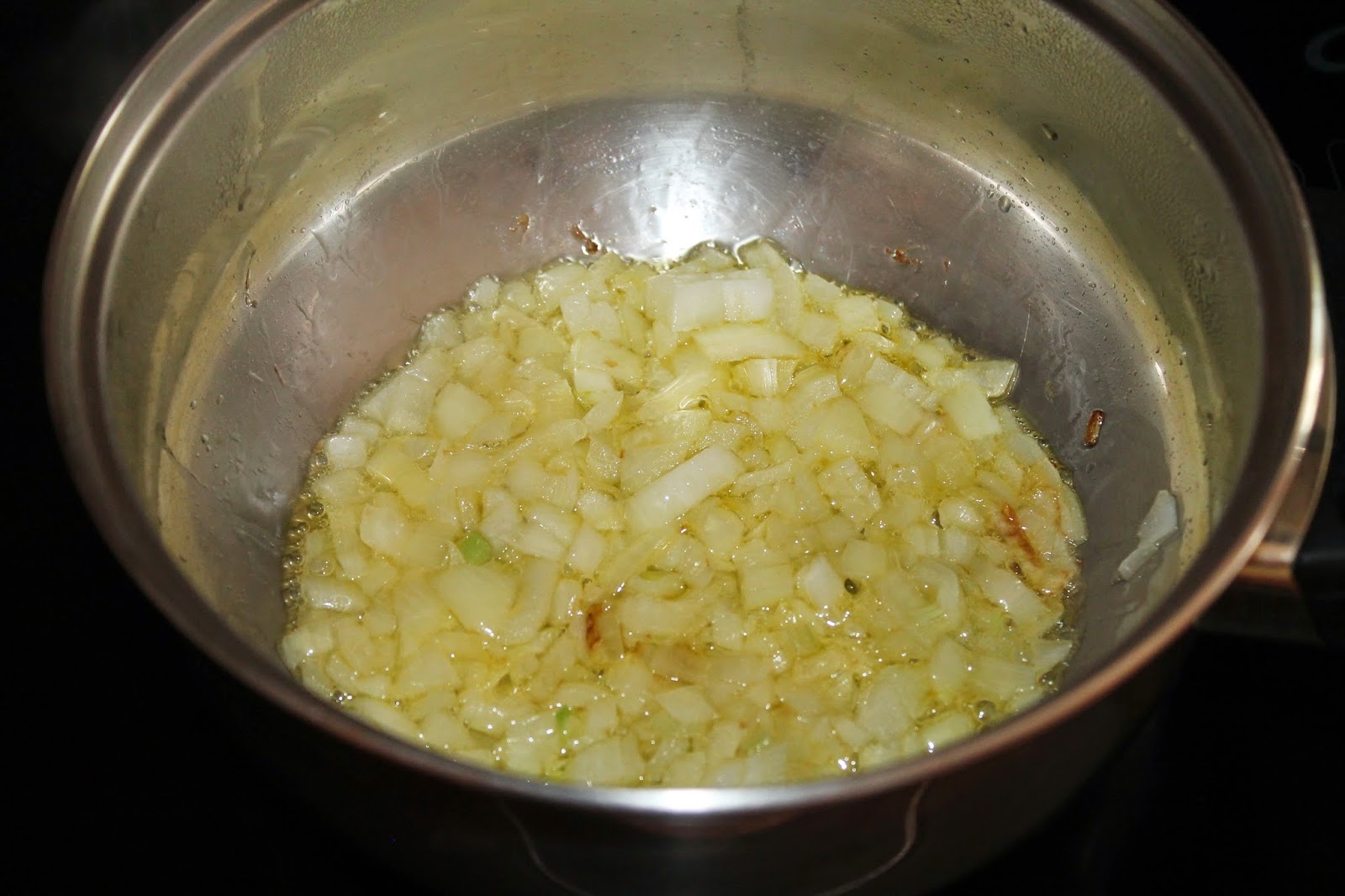 Ponemos la cazuela con el chorrito de aceite a calentar y echamos la cebolla picada.