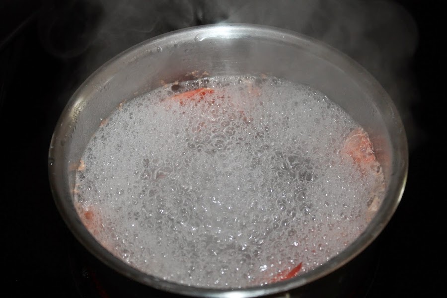 Lo sofreímos y cuando esté le echamos el agua, o caldo de pescado. También podemos poner a hervir las cabezas y cascaras de las gambas y utilizar esta como fondo.