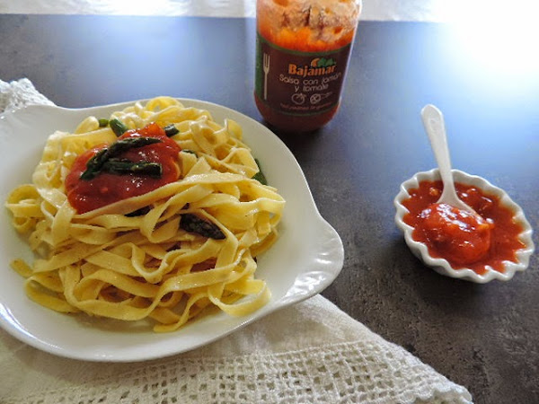 Bajamar me ha mandado una caja llena de productos uno de ellos la salsa de tomate con jamón con la que he preparado la receta de hoy.Una salsa tomate con mucho sabor.Un suave sabor a jamón que nos ha encantado a todos.