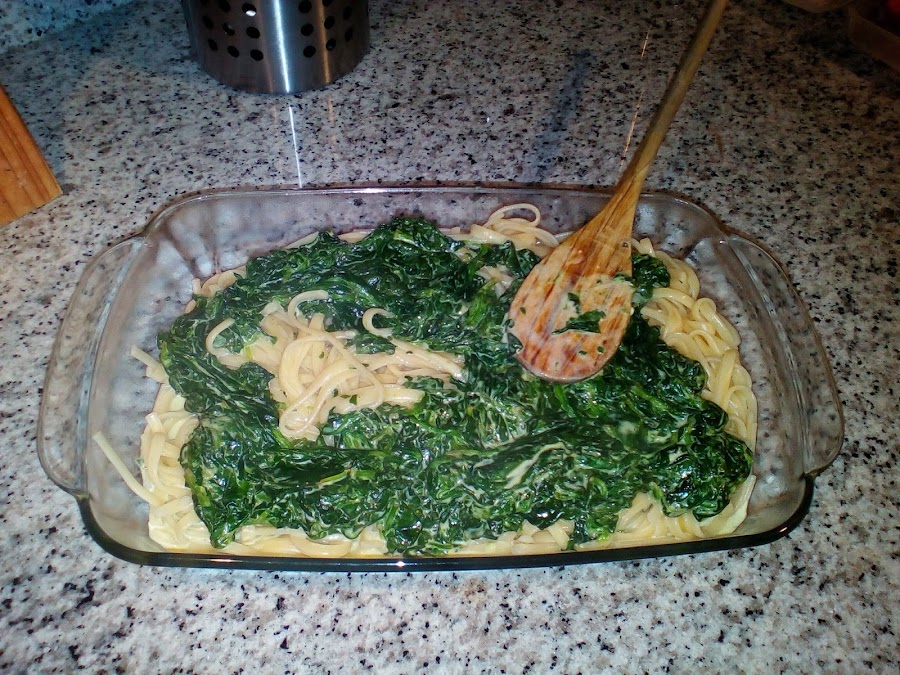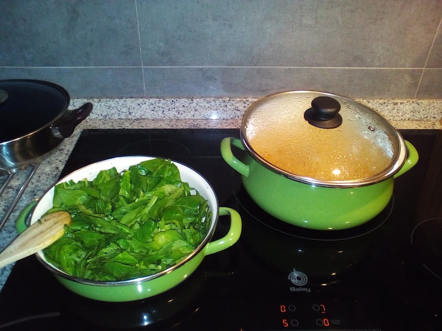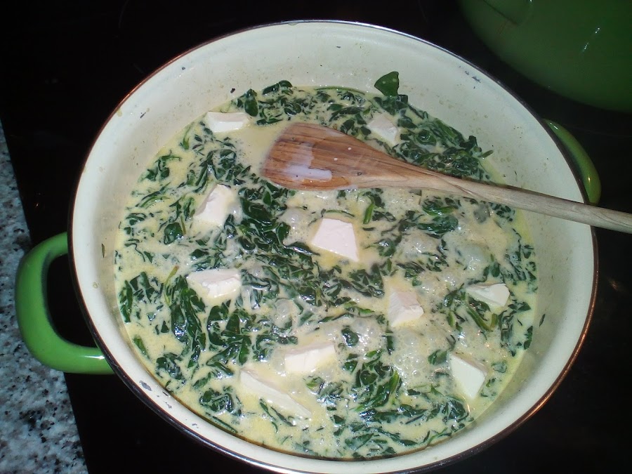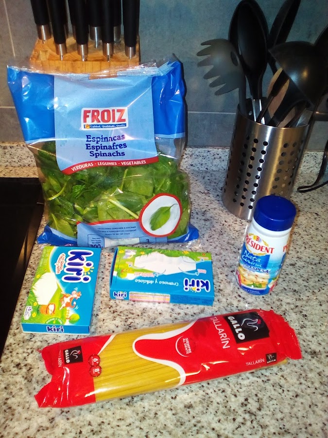 En una sarten grande echaremos un buen chorro de aceite de oliva y cuando esté caliente añadiremos las espinacas. Las cocinaremos hasta que se re reduzcan tanto que parezcan una pasta. En ese momento añadiremos la nata (crema de leche), la sal la pimienta y revolveremos con mucho cuidado mientras espesa un poco. Para luego añadir dos o tres quesitos Kiri.