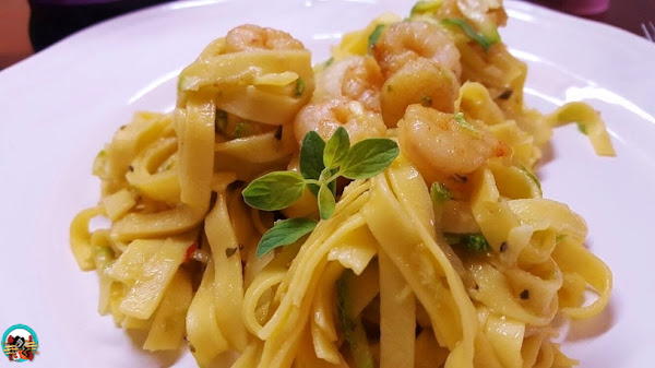 Algunas fórmulas culinarias son muy versátiles, como este plato de tallarines con gambas y calabacinos.