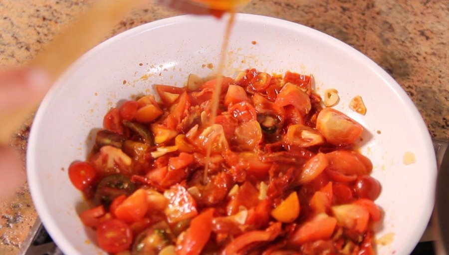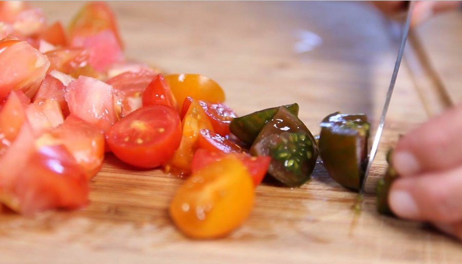 Lo primero que preparamos es la salsa o mezcla especial de tomate. Para ello, ponemos a hidratar unos minutos antes los tomates deshidratados y cortamos en cuadrados pequeños los otros dos tipos de tomate. Una vez que tenemos hidratados los tomates secos, también los cortamos en tiras pequeñas.