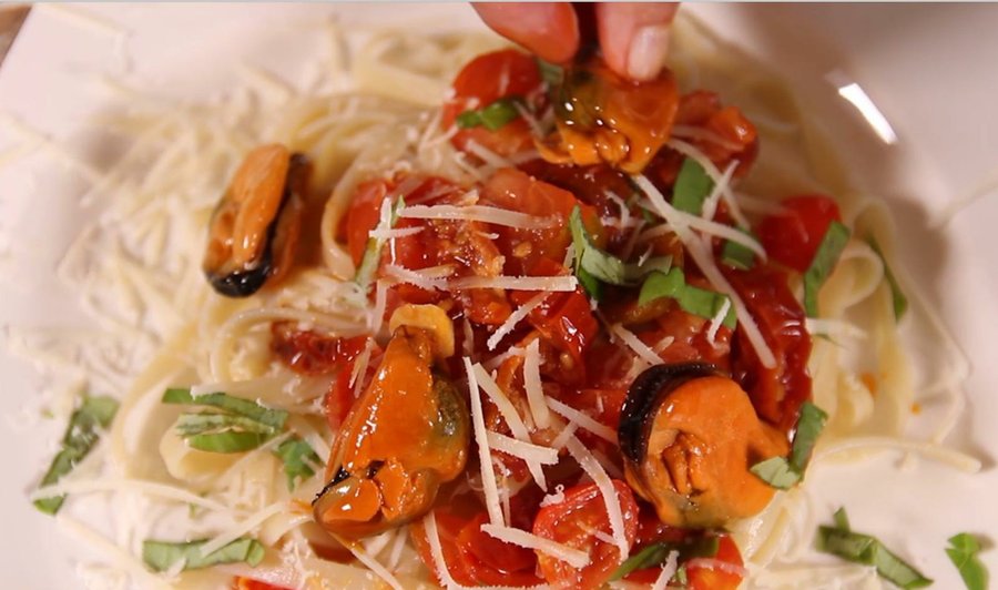 Tallarines con salsa de tres tomates al ajillo y mejillones