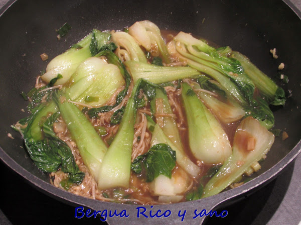 1. Preparamos las verduras: Separamos las setas y las enjuagamos; cortamos el pak choi en cuartos y lo lavamos; cortamos la cebolla en seis finitos, prensamos el ajo y rallamos el jengibre. Reservamos.