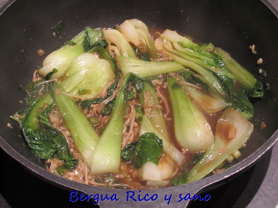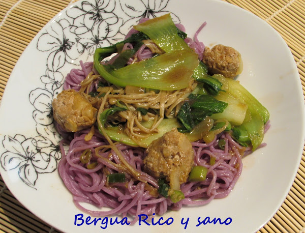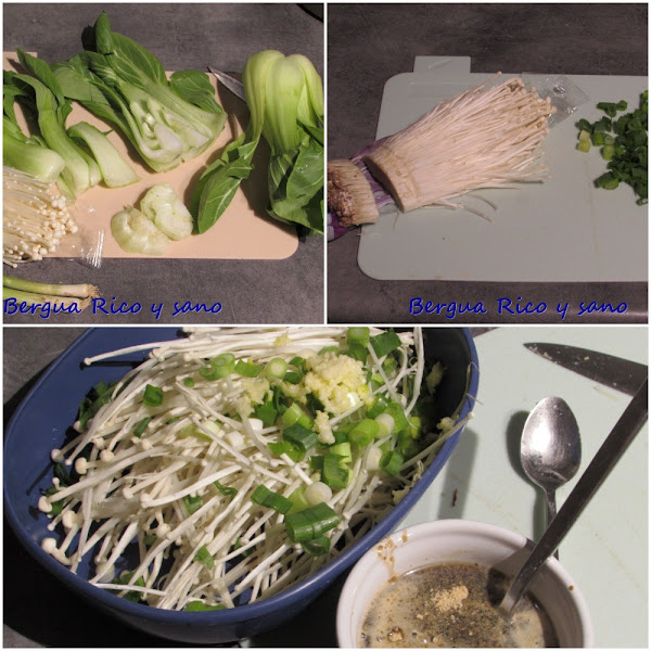 Me he traído a casa pak choi, también conocido como bok choi y repollo chino, y setas enoki. Por lo demás, he improvisado una salsa y he usado unas albondiguillas que hice con lo que me sobró del relleno de mis últimos wantons. Os explico cómo las hice, pero también podéis usar pechuga de pollo, gambas y otras proteínas.