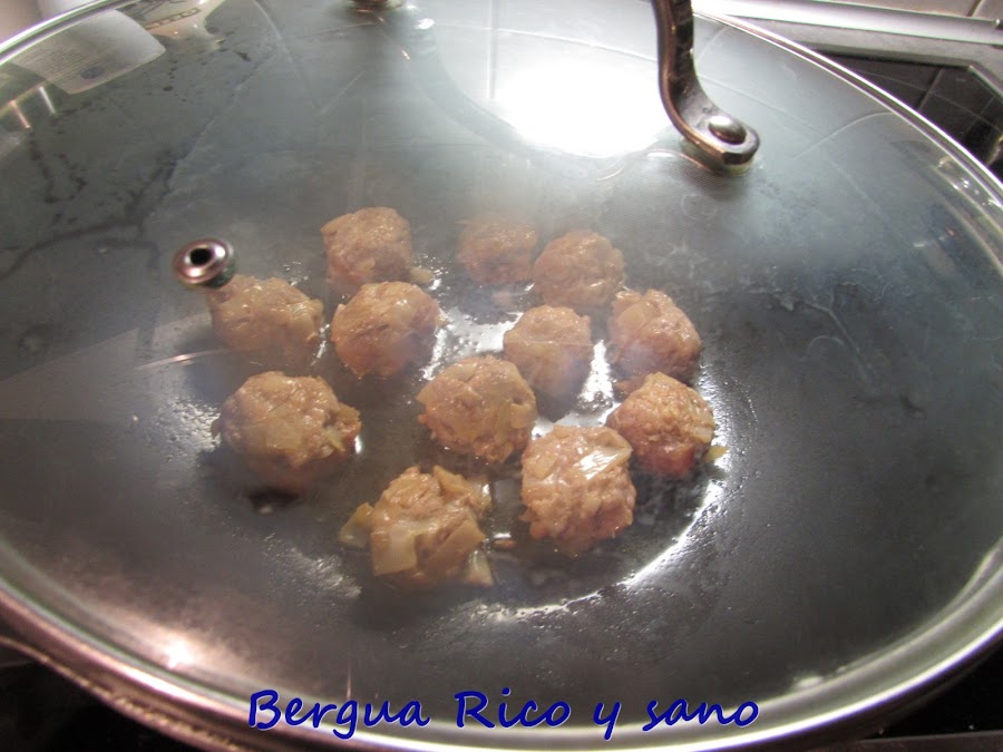 2. Calentamos 1 cucharada de aceite de girasol en el wok y cocinamos las albondiguillas a fuego medio-lento y tapadas, para que se cueza por dentro y tomen color por fuera. Las sacamos y reservamos.