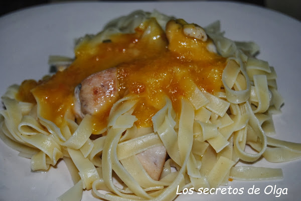 En un plato ponemos los tallarines, añadimos el pollo y acabamos con la salsa de mermelada de naranja.