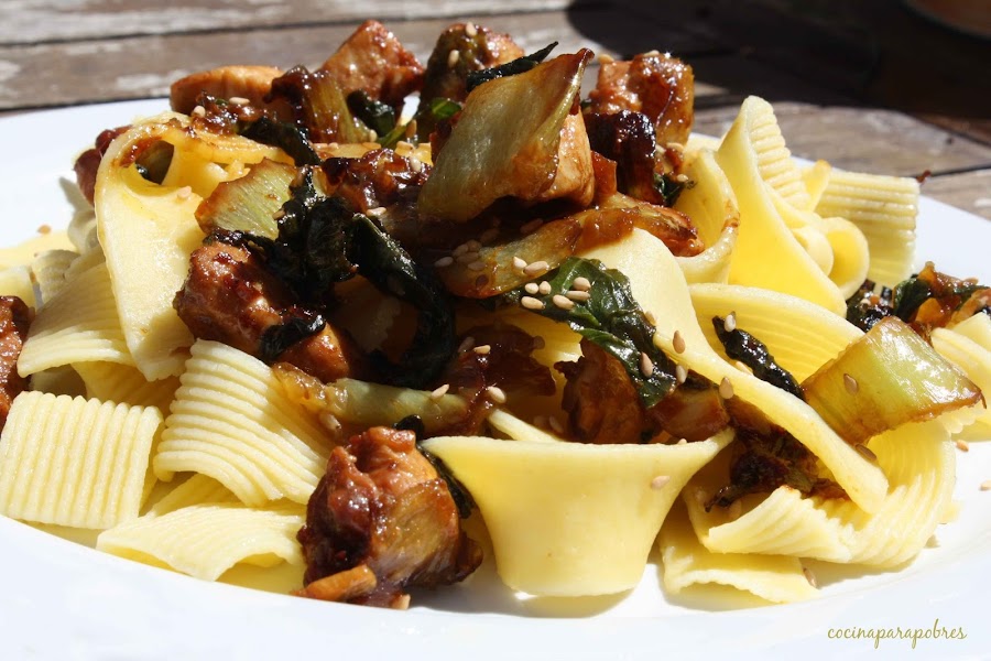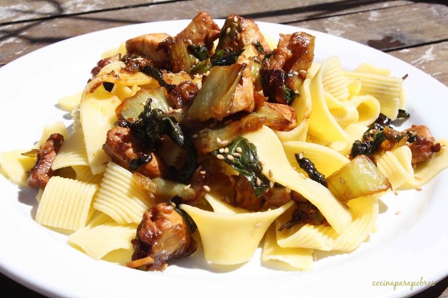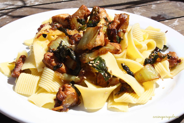 Movemos para que se haga todo por igual, y cuando veamos que el pollo esta hecho incorporamos la hoja del pak choi picada junto a la soja y unas semillas de sésamos. Pasado 5 minutos apartamos y servimos junto a la pasta.
