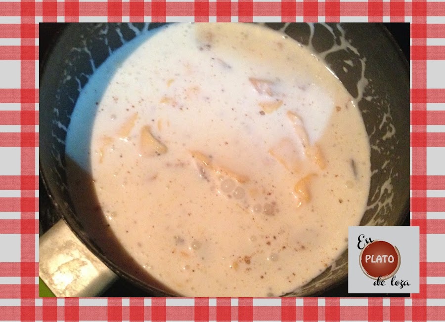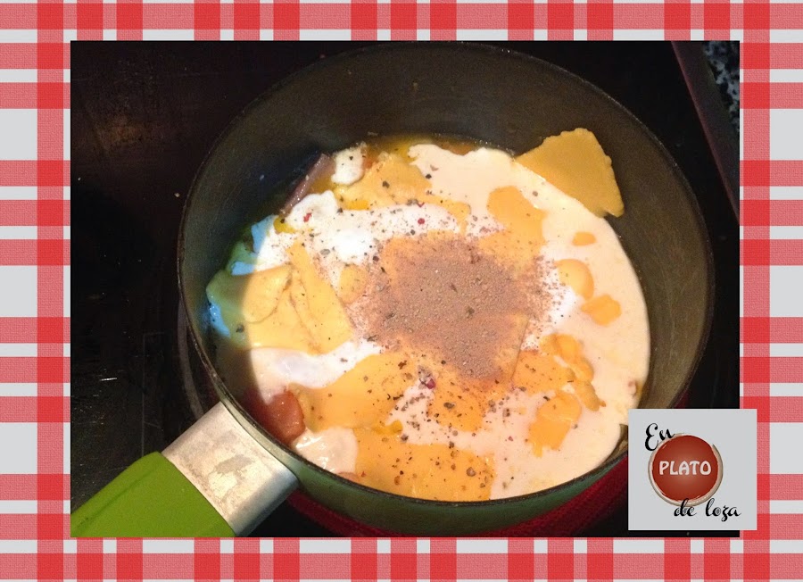 Es el momento de añadir la nata (crema de leche) y los quesos en lonchas y bajar a fuego medio removiendo hasta que los quesos se diluyan en la nata (crema de leche). Luego añadiremos un poco de nuez moscada y un poco de pimienta. Removemos y retiramos del fuego.