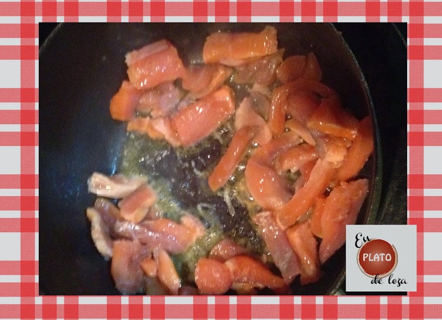Mientras cortamos el salmón en tiras, y lo salteamos un minuto con una nuez de mantequilla, hasta que cambien su color.