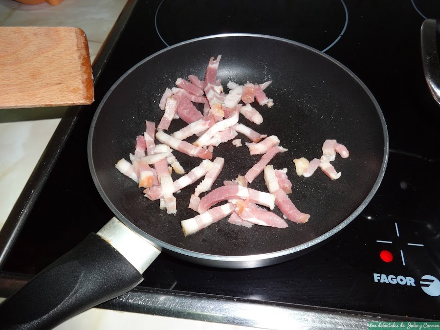 Salteamos en una sarten el bacon con un poquito de aceite y dejamos reservado mientras preparamos la salsa.