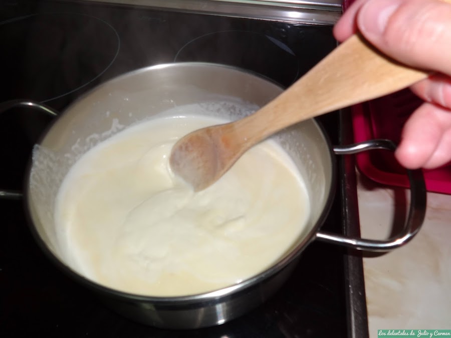 Cuando la tengamos derretida, vertemos la nata (crema de leche) y removeremos de forma constante. Cuando veamos que la nata (crema de leche) empieza a tener consistencia, echaremos el queso, un poco de ajo en polvo y pimienta molida.