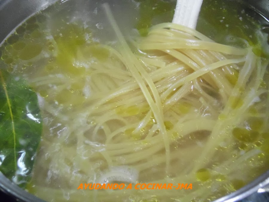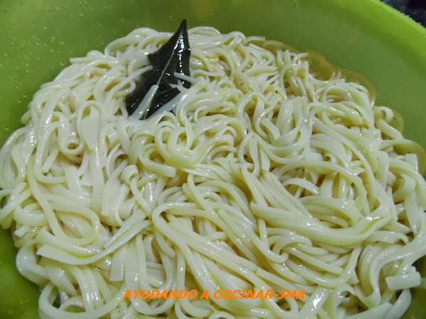 En otro recipiente, con agua hirviendo, un poco de sal, aceite de oliva virgen y dos hojas de laurel, introducir los tallarines y cocerlos siguiendo las instrucciones del fabricante.