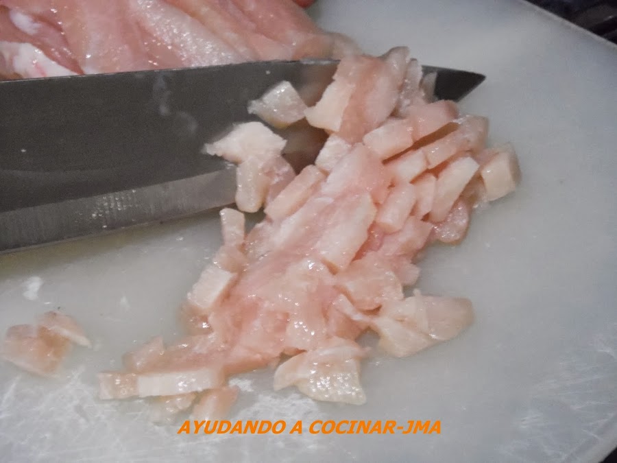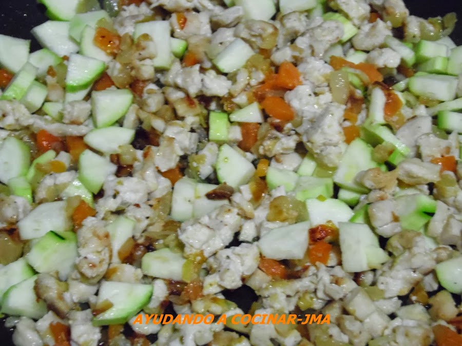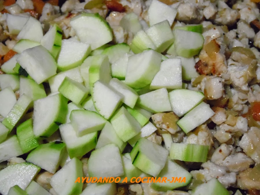 Una vez se ha cocinado unos minutos la pechuga de pollo, incorporar el calabacín cortado en cuadrados ( es opcional quitarle la piel, lo que si es importante, es lavar muy bien las verduras).