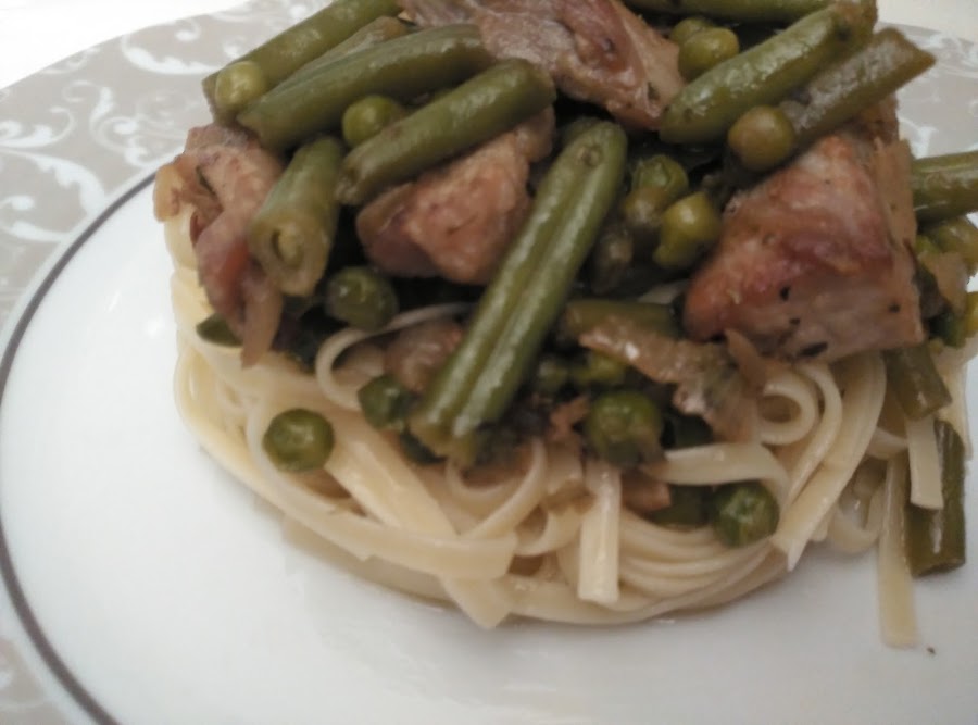 100g de verdura cocida, yo utilicé guisantes y judías verdes, pero si quieres puedes poner, zanahorias, habas.....