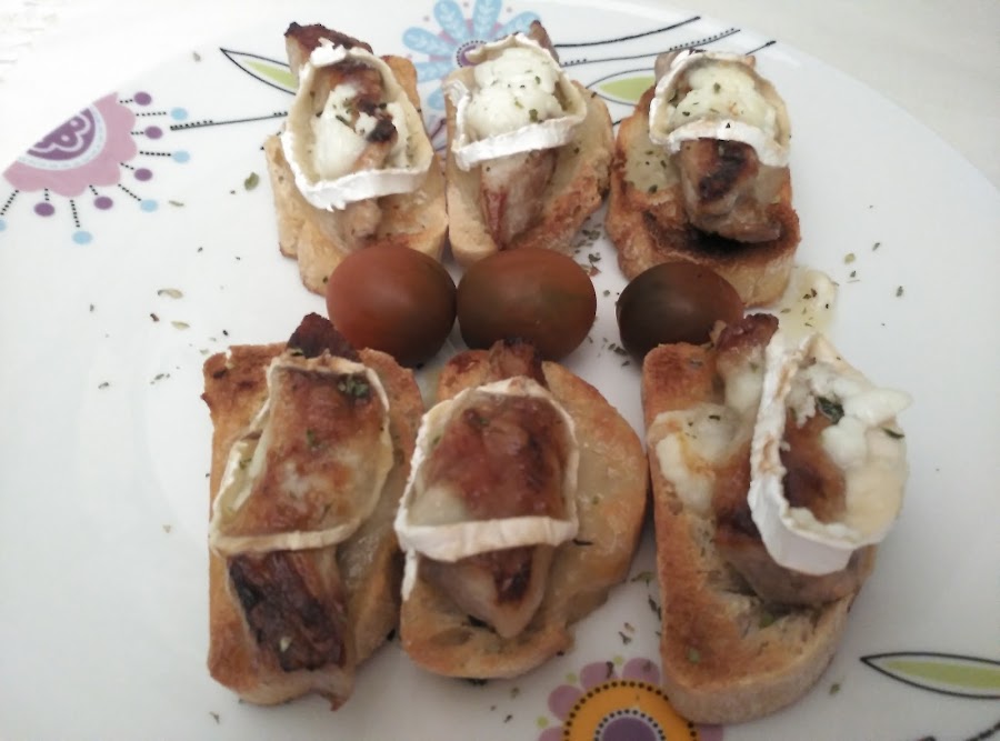 Corté unas rebanadas de pan y las tosté. Encima de cada una de ellas puse una tira de secreto, la salé con sal gorda y le puse orégano, corté unas rebanadas de queso de rulo de cabra y lo gratiné. Estaba buenísimo. Me quedo así: