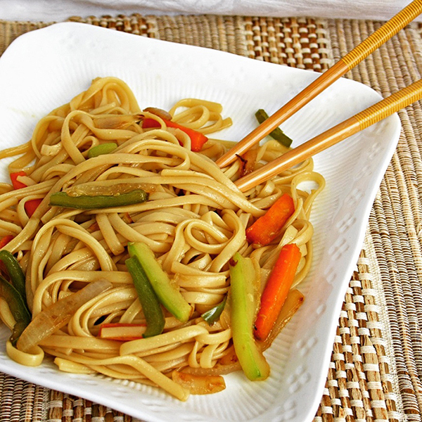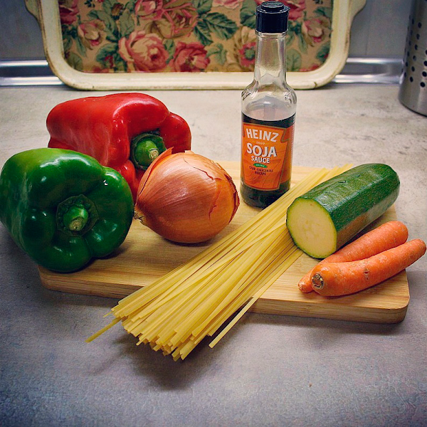 6. Juntamos toda la verdura en una fuente - plato - lo que sea, escurrimos los tallarines, los mezclamos con la verdura y añadimos 3 cucharadas de salsa de soja y mezclamos todo.¡Ya tenemos los tallarines chinos con verduras!