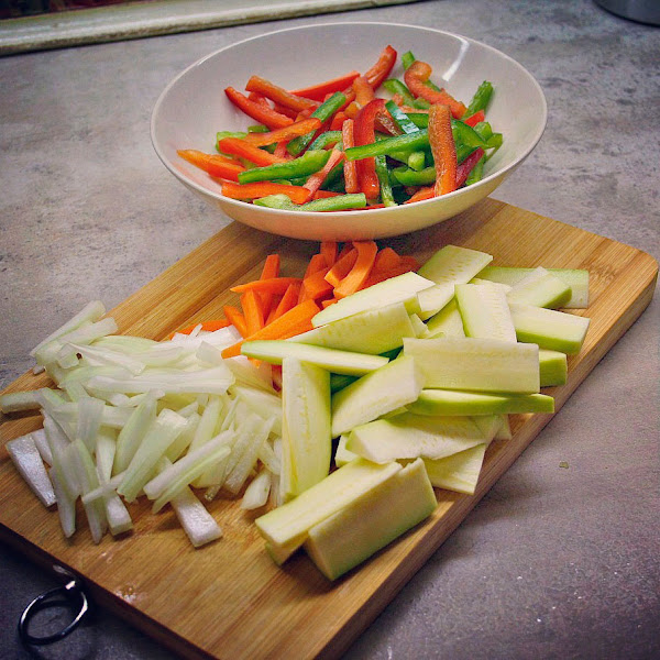 2. Echamos la zanahoria a la sartén con un chorrito de aceite y la tapamos para que se cueza mejor. Seguimos pelando y troceando la cebolla y los pimientos. Cuando la zanahoria se haya reblandecido un poco, echamos el calabacín (Cuidado que se pone tan blando que se deshace!)