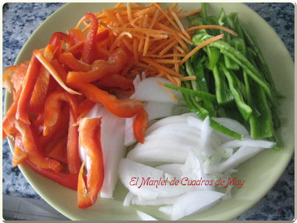 Cortar las verduras que os guste, yo he puesto éstas porque son las más clásicas, pero se puede poner de todo lo que te guste de verduras. Yo las he cortado en bastoncitos finos.