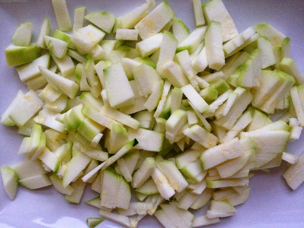 1 Comenzamos pelando el calabacin,una vez pelado lo cortamos en trozos que no sean demasiado grandes,en Brunoise .