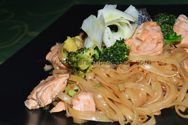 Al final tenía que pasar... hemos juntado tres de nuestros productos favoritos en la cocina otra vez: salmón, brócoli y tallarines de arroz.