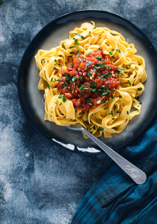 Una de las primeras veces que preparé pasta fresca fue hace más de dos años, en aquella ocasión con una receta dulce de Raviolis de chocolate y pistachos, ¡qué ricos estaban! Esta vez tocó salado y además quise probar a hacer la pasta con zanahoria. El resultado fue un éxito rotundo. Los deliciosos tallarines de zanahoria acompañados de una picantita salsa arrabiata estaban para rechupetearse los dedos. Los dos nos quedamos con ganas de repetir!!!