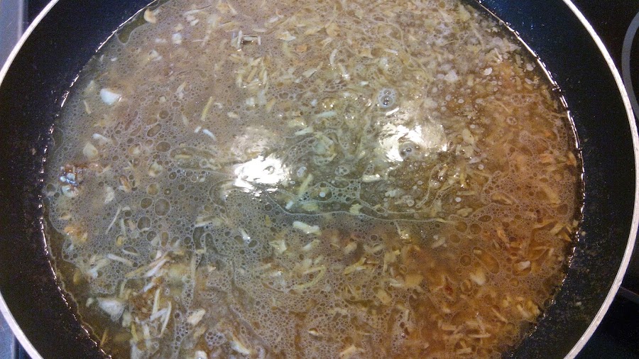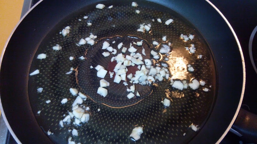 Picamos los ajos y en una sartén grande con un chorreón de aceite los sofreímos.