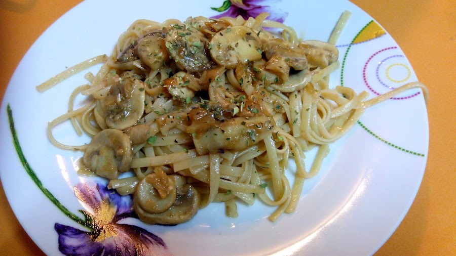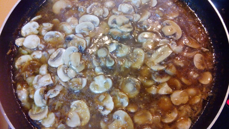 Removemos, dejamos un par de minutos y añadimos los champiñones. Dejamos cocinar a fuego lento para que se vaya haciendo la salsita.