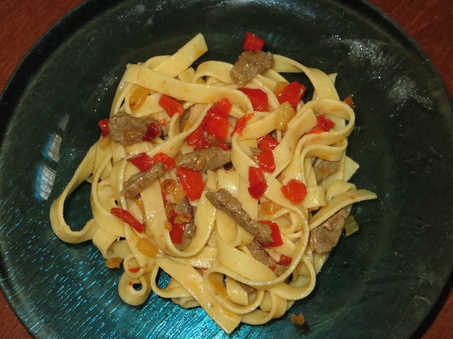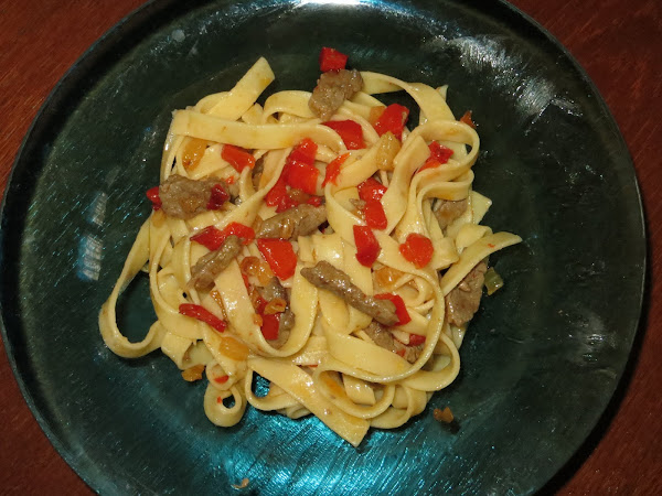 Lo primero que hacemos es poner a hervir los tallarines tras leer las instrucciones del envase. Mientras ponemos aceite en un wok o sartén y vamos friendo la cebolla y el pimiento rojo a fuego suave. Cuando lleven un rato añadimos los ajos picados y cuando estén casi cocinados el filete de ternera en tiras.