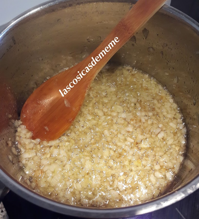 Pelamos y partimos la cebolla y el ajo, muy picadito.