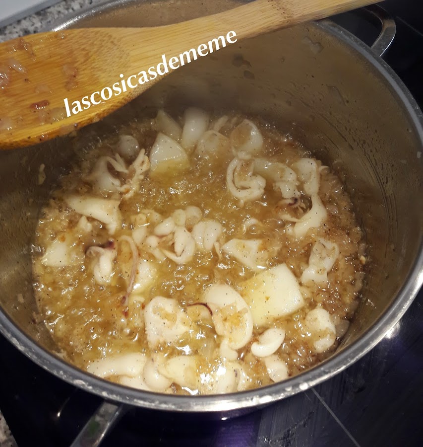 Ponemos una sartén al fuego con dos cucharada de aceite, sofreímos la cebolla y los ajos, solo que se sofrían, que no cojan color, añadimos las sepias partidas en trocitos, las sofreímos hasta que se evapore el agua que sueltan, añadimos las colas de los gambones les damos unas vueltas hasta que cambien de color, añadimos las dos cucharadas de jerez, dejamos que evapore, añadimos la nata (crema de leche), el perejil, comino, dejamos se cocine unos minutos con fuego medio, probamos de sal y comprobamos el picante, tiene que estar un poco picantito, reservamos.
