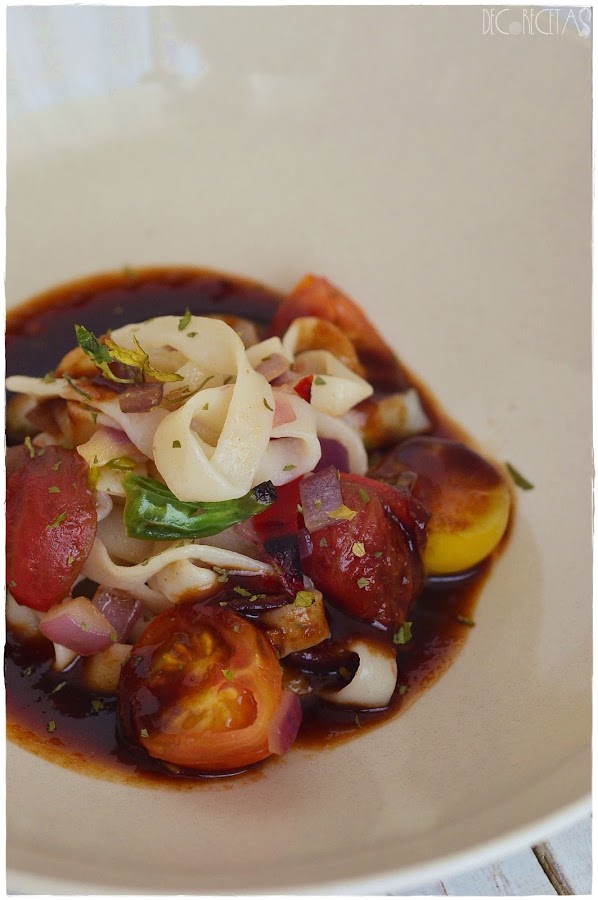 Se comen fríos y su otro ingrediente principal es el tomate pasado por la plancha, de esta manera resulta un plato templado junto con el tallarín de calamar.