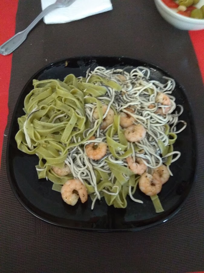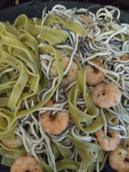 Ahora mezclamos los tallarines con las angulas sucedáneas y a comer.