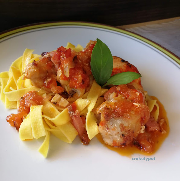 INGREDIENTES: (2 personas) Tallarines frescos. Medio pollo troceado en trozos pequeños, 1 tomate pelado, 2 ajos, 1/2 cebolla, beicon, orégano, tomillo, 1/2 pastilla de avecrem, sal, 1 vasito de vino blanco tipo Montilla y aceite de oliva AOVE. 1 cucharadita de azúcar, tomate concentrado o tomate frito y queso parmesano.