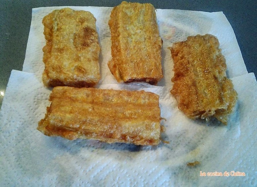 Partir el bacon del tamaño de las acelgas, poner una loncha entre cada dos pencas de acelgas. Rebozar en harina y luego por huevo y freír en abundante aceite caliente. Reservar en papel de cocina para que suelten el exceso de aceite.