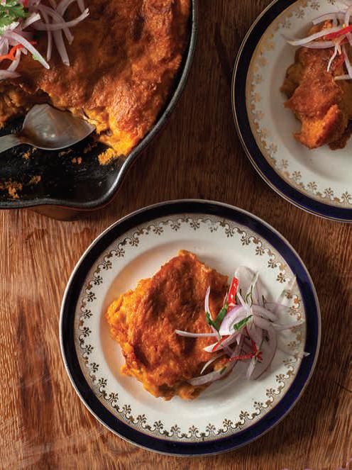 Rallar los choclos y reservar. Cortar la panceta de cerdo en trozos. En una sartén poner 1 cucharada de manteca con los granos de achiote. Cuando la manteca se tiña con el color del achiote, retirar los granos. Con esa manteca hacer un aderezo con la cebolla y el ajo. Dorar a fuego bajo por 10 minutos. Agregar el perejil y condimentar con sal, pimienta y orégano. Luego añadir trozos de cerdo y dejar que se cocinen hasta que doren y suelten parte de su grasa. Cuando la panceta está dorada, incorporar el caldo de verduras y dejar a fuego lento hasta que la carne esté cocida. Probar y rectificar la sazón si fuera necesario. Retirar los trozos de cerdo y dejar enfriar. Reservar el aderezo y caldo que quedó para agregarlo a la masa del tamal. Untar un molde o cazuela que pueda ir al horno con un poco de manteca. Reservar hasta el momento de armar el tamal. El resto de la manteca calentarlo en una olla y añadirle el ají panca y el ají mirasol. Dorar por 5 minutos a fuego bajo y luego ir echando poco a poco el choclo rallado, sin dejar de remover. Condimentar con sal, agregar el anís en grano y 1 1/2 tazas del caldo en el que se cocinó el cerdo, con todo su aderezo. Seguir removiendo hasta que el choclo esté cocido. Retirar la preparación del fuego, añadir los huevos crudos y la yema previamente batidos, unir todo bien. Dividir esta masa en dos partes iguales para preparar el molde del tamal. Poner en el molde previamente untado con manteca la mitad de la masa de choclo. Colocar encima la panceta de cerdo cocida, el maní, las nueces, los ajíes en rajas, los huevos cocidos cortados en trozos y las aceitunas. Extender encima la otra mitad de la masa del choclo y emparejar con un tenedor. Llevar al horno a temperatura media por 20 minutos, para que tome consistencia y se dore un poco. Retirar del horno, dejar reposar y luego servir acompañado de salsa criolla.
