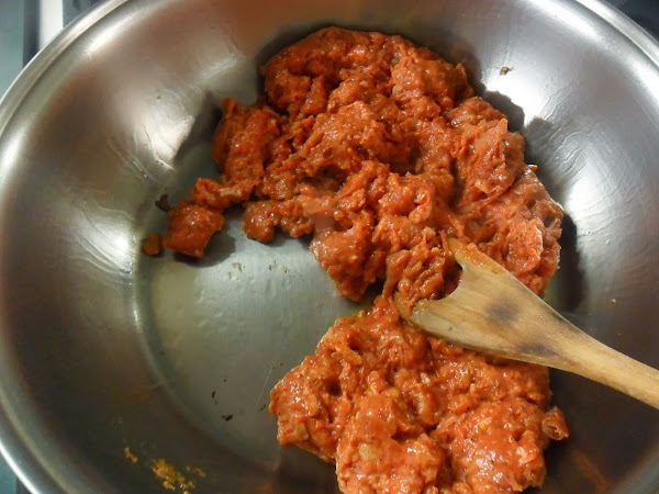 § En una sartén muy caliente con una cucharada de aceite, sofría el chorizo y déjelo enfriar un poco.