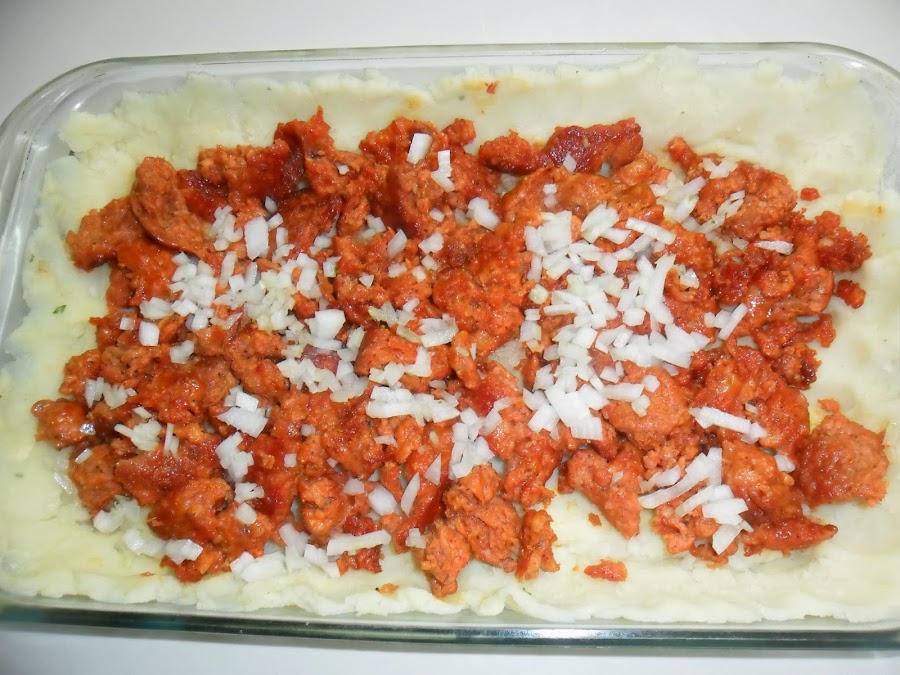 § Reparta sobre el chorizo, la cebolla y la mitad del queso.