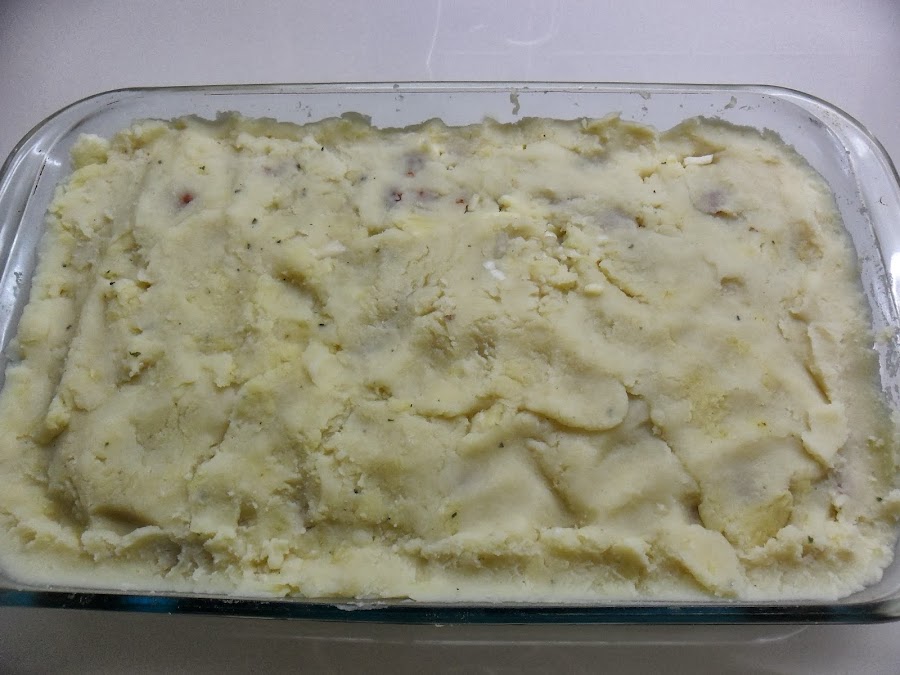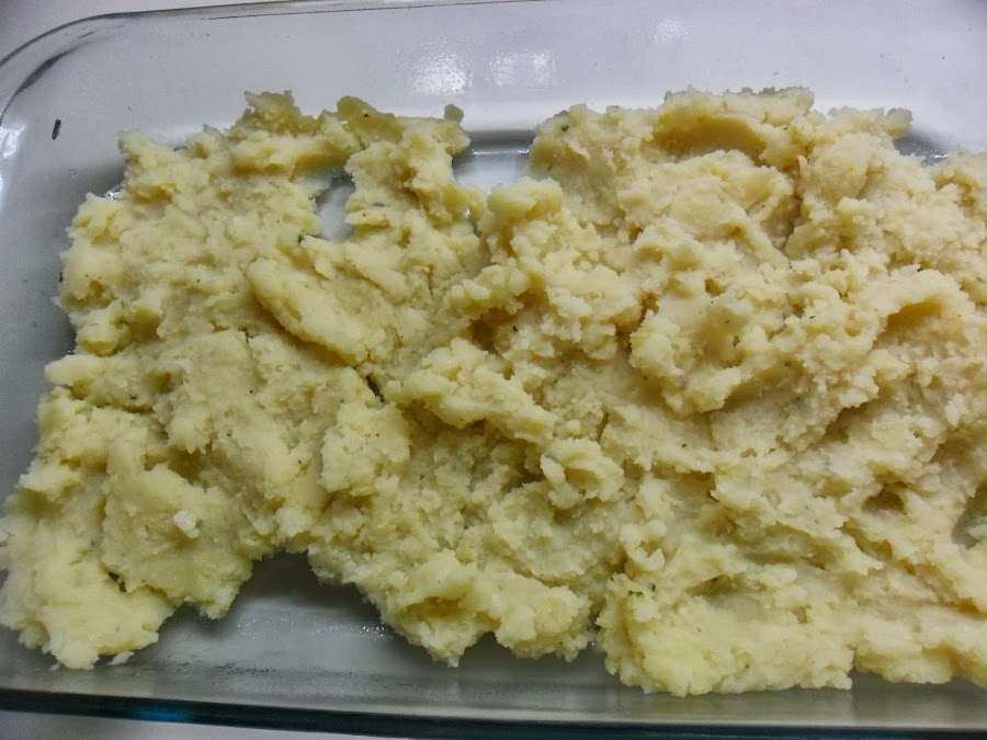 § Forre el fondo y las paredes del molde con puré aplastándolo, que sea una capa no tan gruesa, como de ½ centímetro aproximadamente