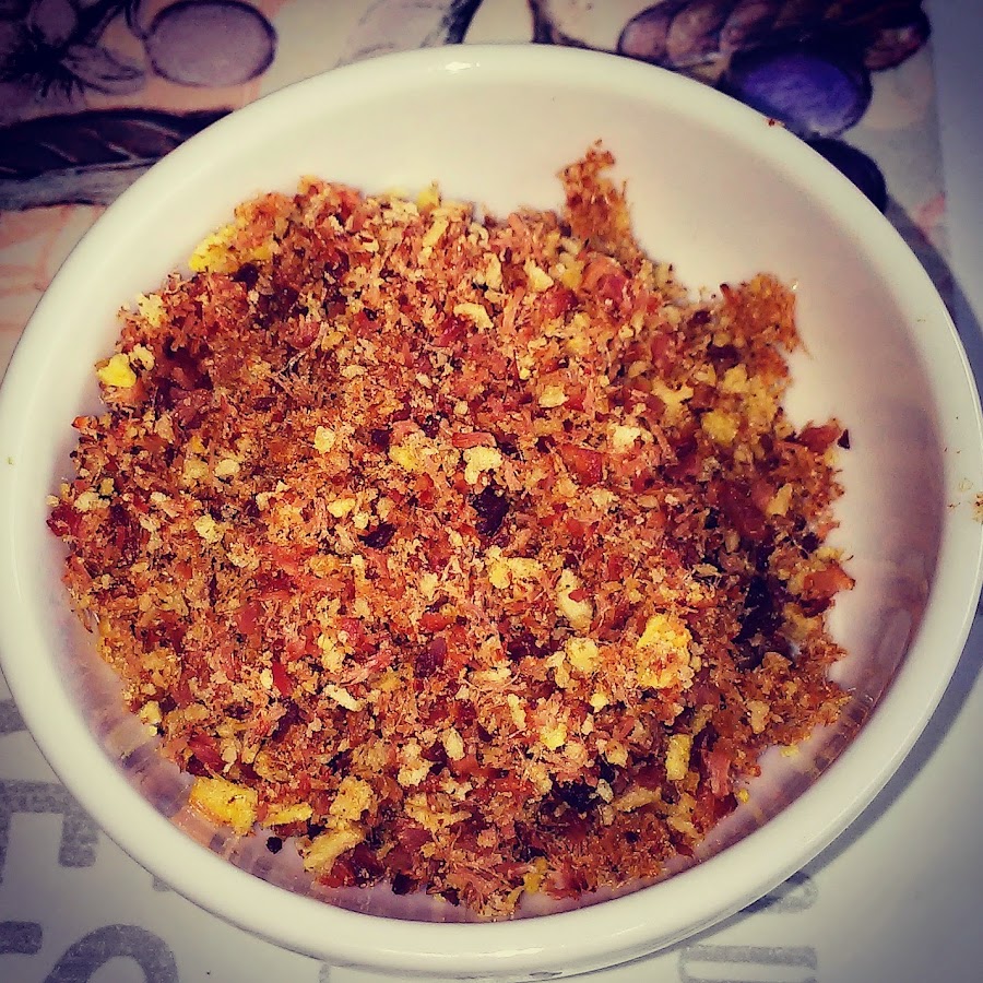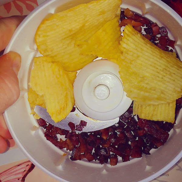 Mientras tanto tostamos el jamón y cuando tome color lo retiramos y lo picamos muy fino con las patatas fritas. Reservamos.