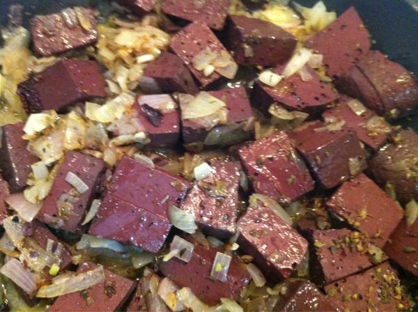 Picamos la sangre en cuadraditos , y la cebolla también.