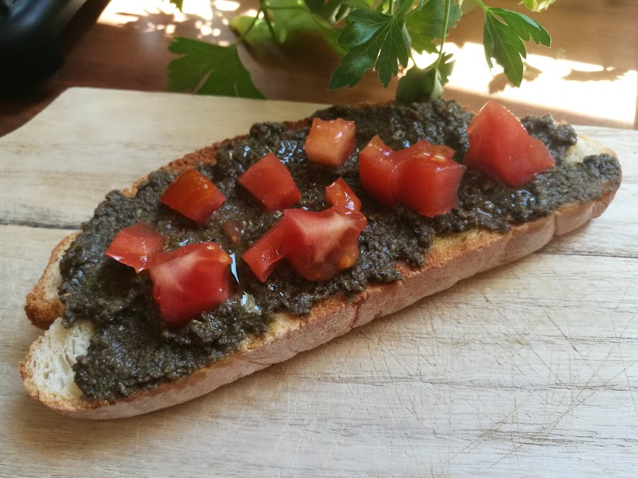 - Untamos el pan con el tapenade y repartimos el tomate picado por encima. Regamos con un hilo de aceite justo antes de servir.