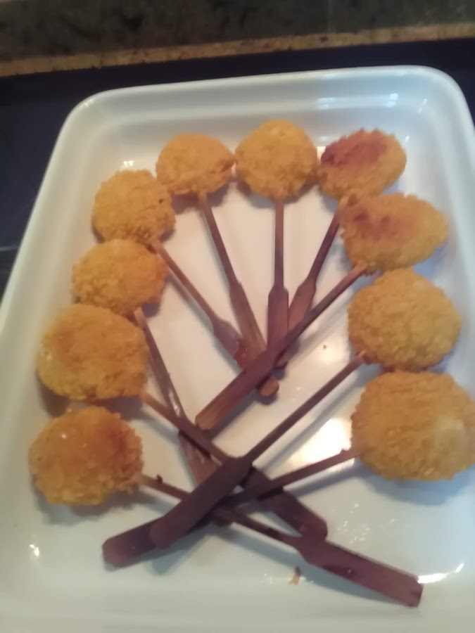 Se puede tomar solos o acompañados de alguna salsa como ketchup mahonesa o cualquier tipo de salsa que se te puede maginar. A mí personalmente me gustaron más las piruletas de langostino y uno de los bocados de merluza estaba bastante bien.