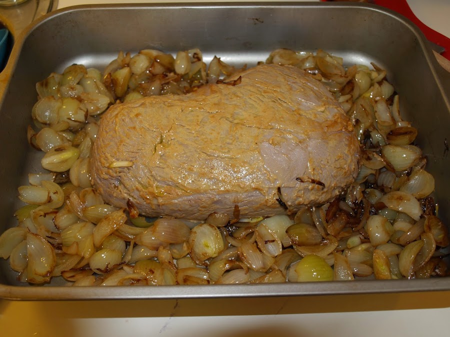 - Cuando estén listas las cebollas y la carne dorada, bajamos el horno a 180º C, echamos las cebollas en la bandeja con la carne y vino blanco a discreción y horneamos.