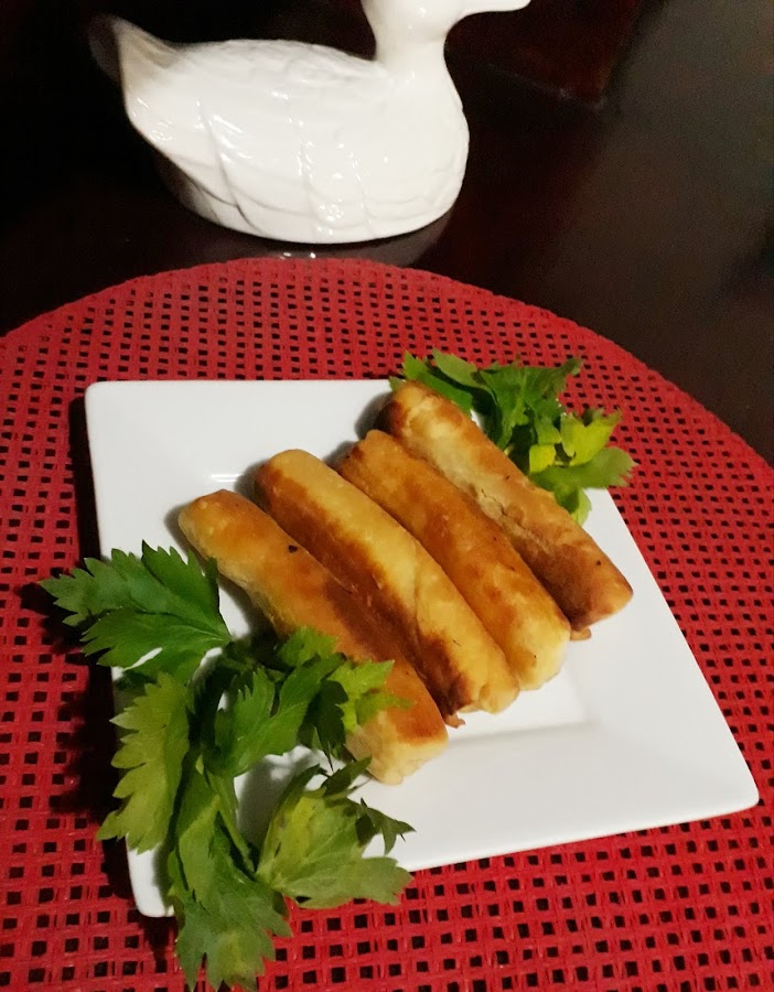 Para preparar la pasta licuar la harina,agua,huevo,sal y mantequilla derretida,tomar un cuarto taza de la preparación y colocar en una sartén mediana caliente ligeramente engrasada con aceite o mantequilla dejar cocinar a apenas dorar,luego dar vuelta dejar unos segundos más y retirar del calor,así preparar el resto de las crepas,para preparar el relleno en una sartén grande caliente colocar el aceite,cebolla,chile,apio y ajo dejar cristalizar,una vez listo agregar la zanahoria rallada,jamón y repollo picado cocinar 10min más,agrega la mostaza,azúcar,vinagre,salsa soya,sal y pimienta cocinar 3 minutos más luego aparte del calor y enfriar,para formar los taquitos en cada crepa colocar 1cda de relleno cerrar los lados arrollar bien,así formar los taquitos,freír los taquitos en el aceite caliente dejar hasta dorar, ya listo colocar en papel toalla para eliminar exceso de grasa,servir junto con la salsa agridulce,la salsa agridulce se prepara mezcle : 1taza salsa de tomate ketchup,3cdas azúcar,2cdas vinagre blanco,2cdas agua,1cda fécula de maíz,media cdita de sal y gotas de tabasco colocar en una olla revolver hasta hervir.