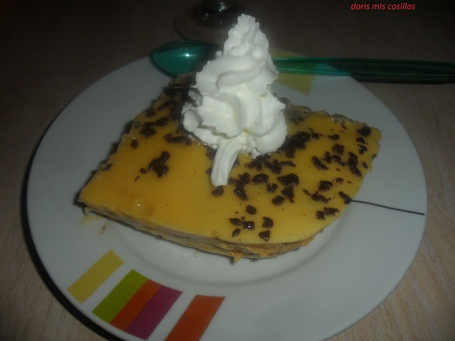 Vamos añadiendo y alternando capas de galletas, flan hasta terminar con la última capa con el flan. Emparejamos con una espátula de cocina y la llevamos a la nevera para que cuage unas horas o mejor de un día para otro.
