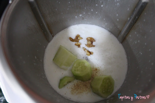 Añadimos el pepino pelado a trozos, las nueces, la sal, la pimienta y el aceite. Trituramos un minuto a velocidad 7. Si queréis que queden tropezones en lugar de batir a velocidad siete, lo batimos a velocidad 4.