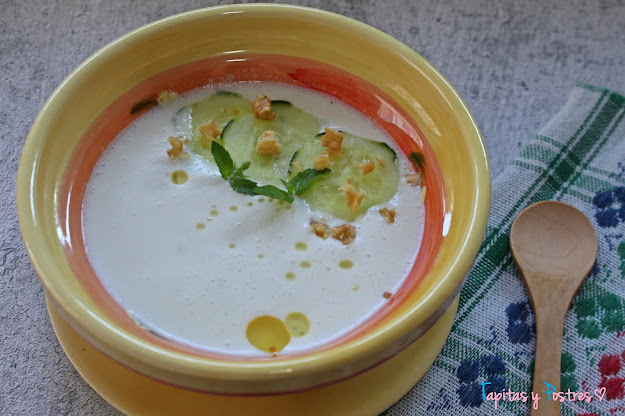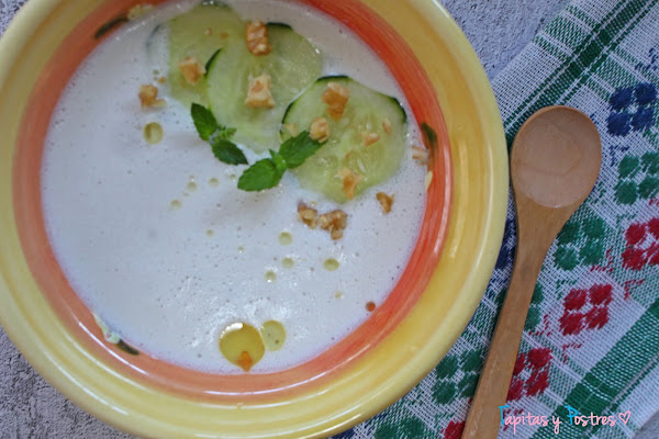 Servimos bien frío adornado con unas rodajas de pepino, unas nueces picadas y un hilo de aceite.